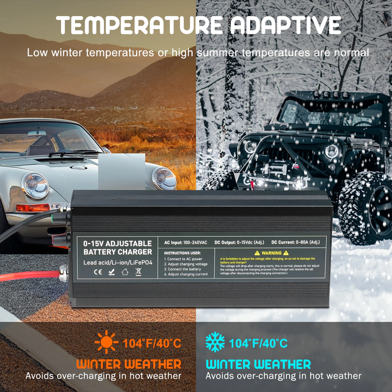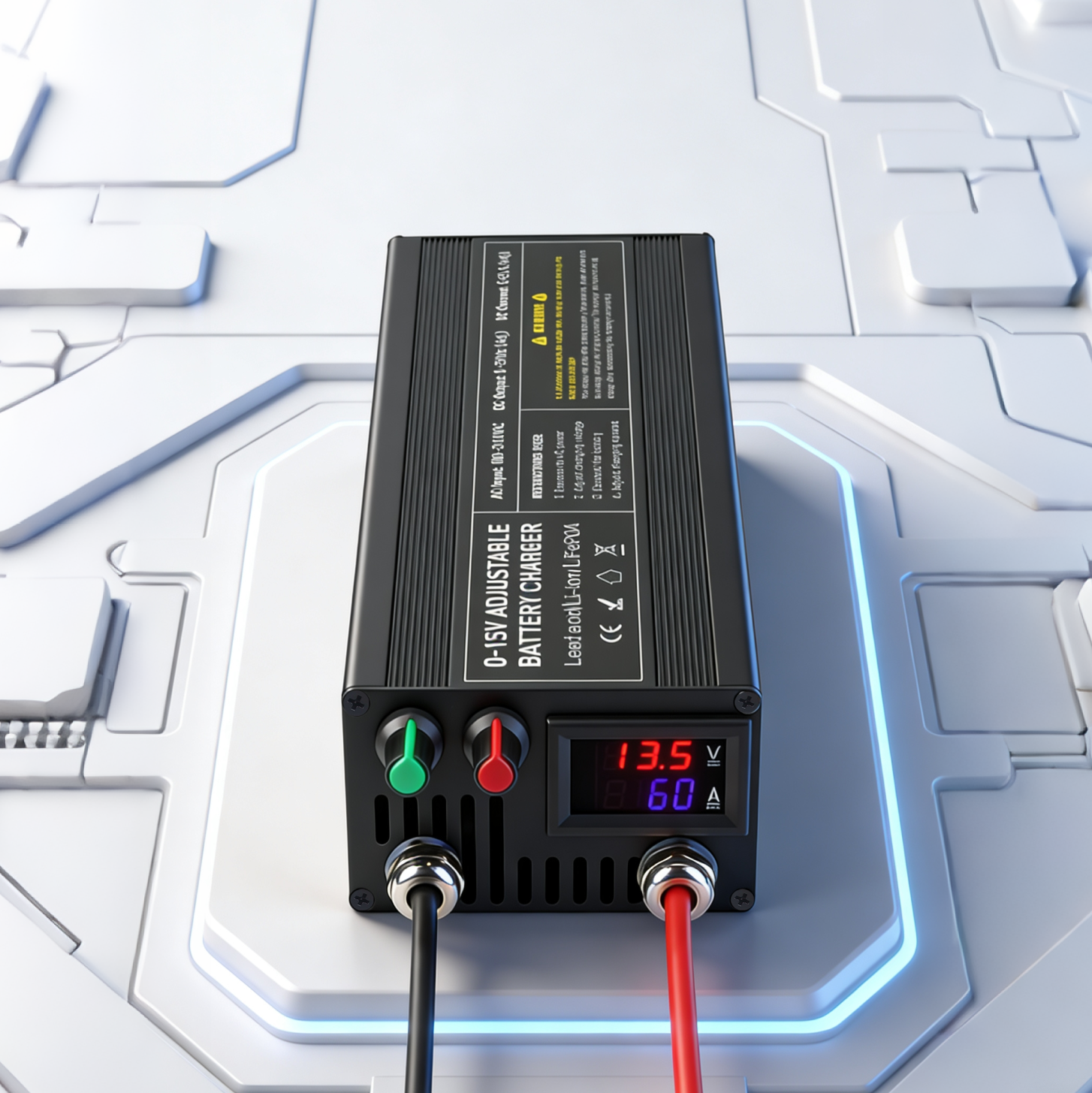 The current/voltage can be adjusted between 0-60A/0-15V. It can fully charge a 12V 60Ah LiFePO4 battery in 1 hour, while an ordinary 3A charger takes 20 hours to fully charge a 12V 60Ah battery, greatly saving time.